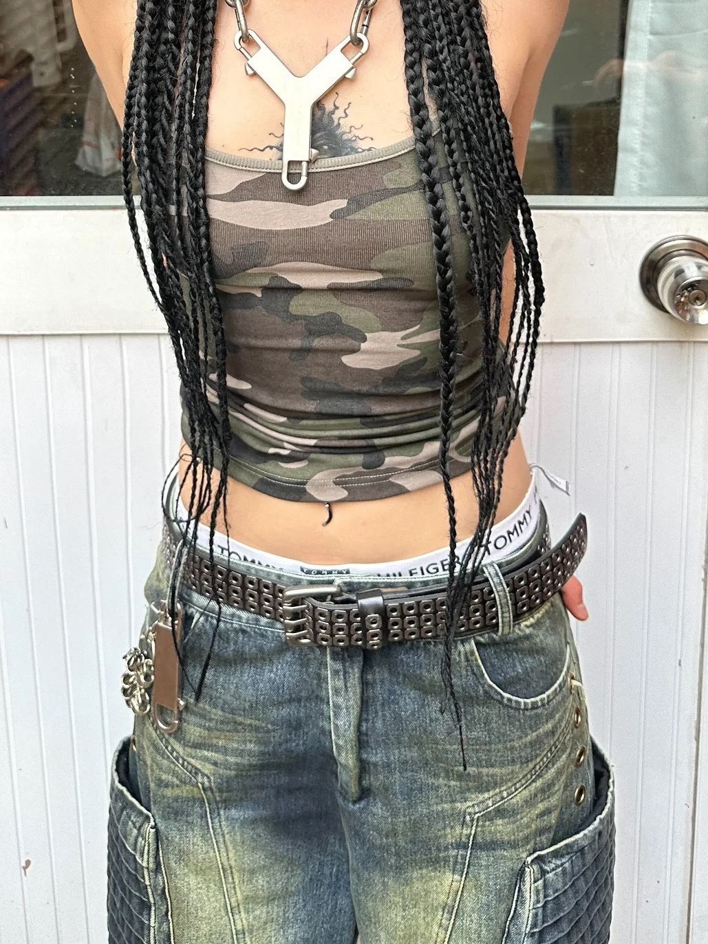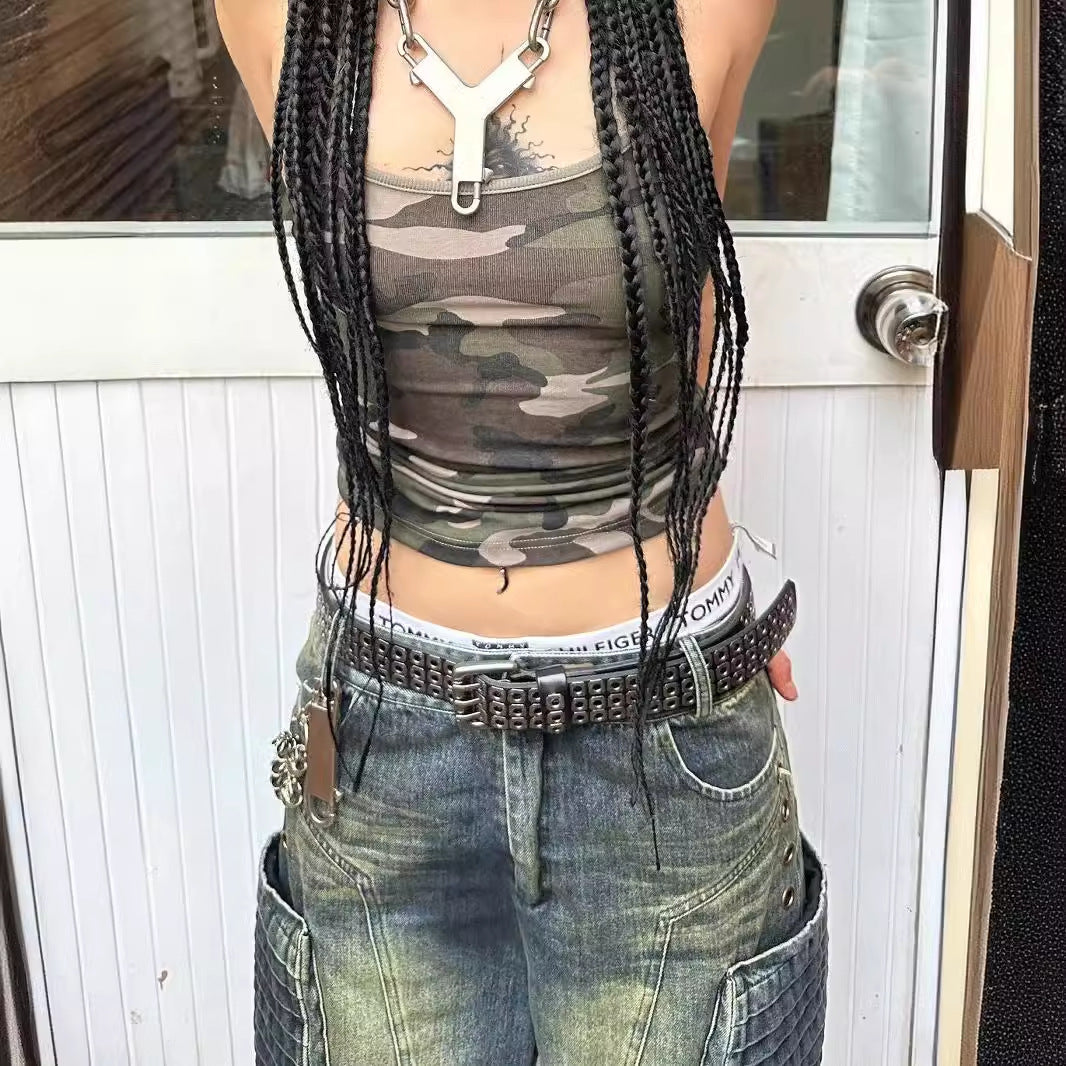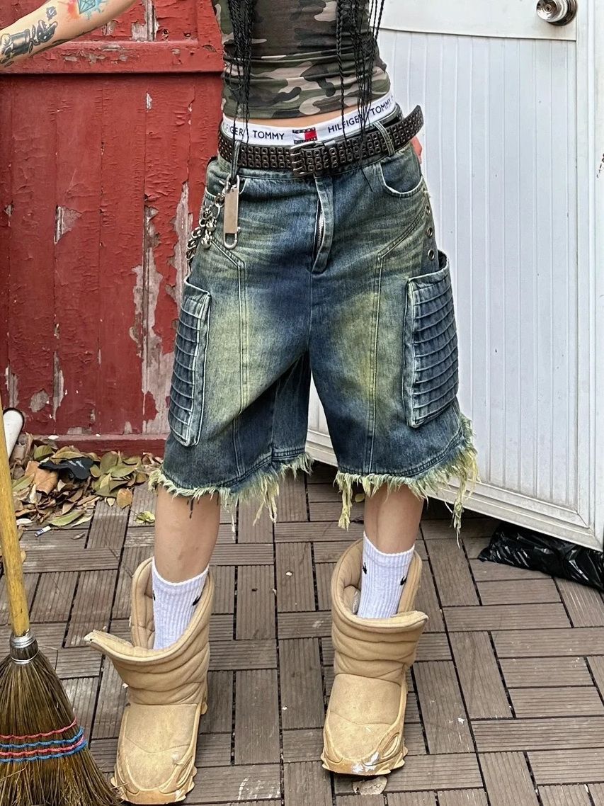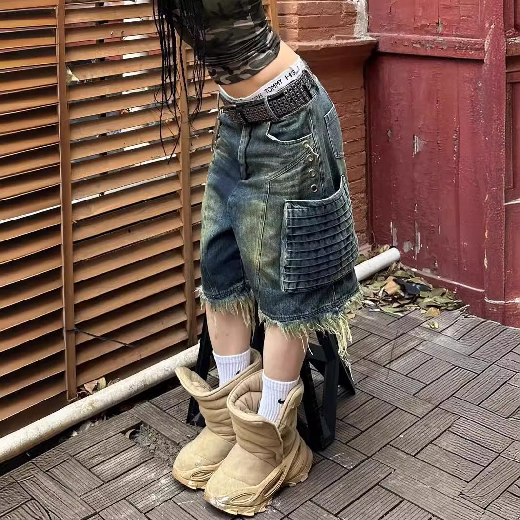 American Retro Plus Size Washed Denim Frayed Workwear With Pocket Cropped Pants